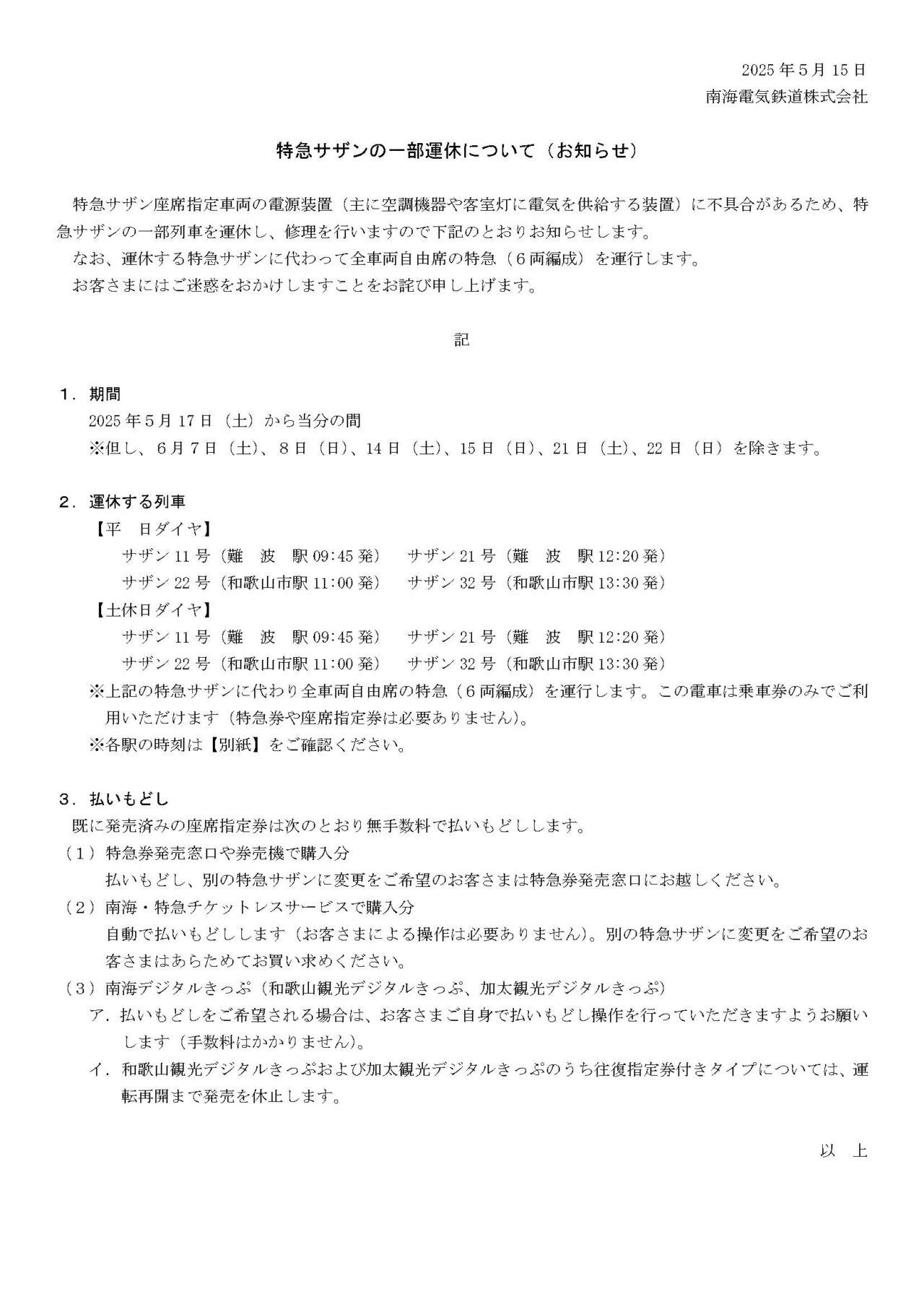 すでに発売済みの座席指定券については、払い戻しの対応を行うそうです。購入方法によって、払い戻しの手続きが異なるようですので、ご注意ください。案内は駅だけでなく、南海電鉄の公式サイトにも掲載されているようです。