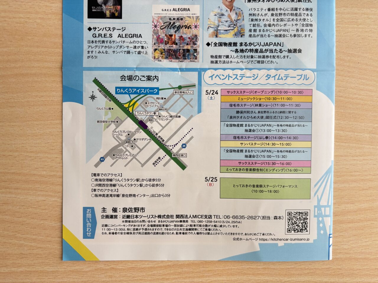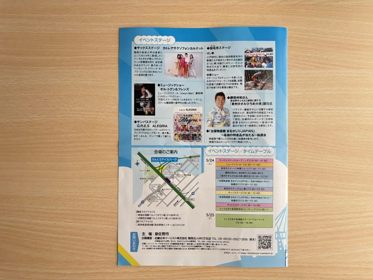 イベントステージには、サックスステージや、ミュージックショー、タレントの勝俣州和さんの「泉州タオルひろめ大使」任命式などがあるそうです。イベントの案内にはイベント当日のタイムテーブルも載っていました。