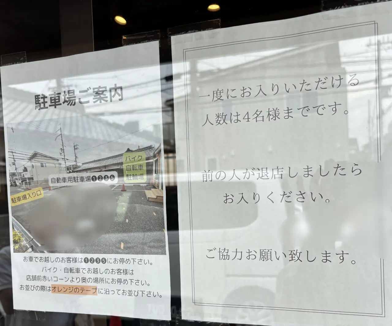 40R外観お店の扉には駐車場の案内と入店についての案内がありました。4名ずつ入店し、購入するようです。駐車場は4台分完備。駐車場の案内についてはInstagramのハイライトからも確認できます。