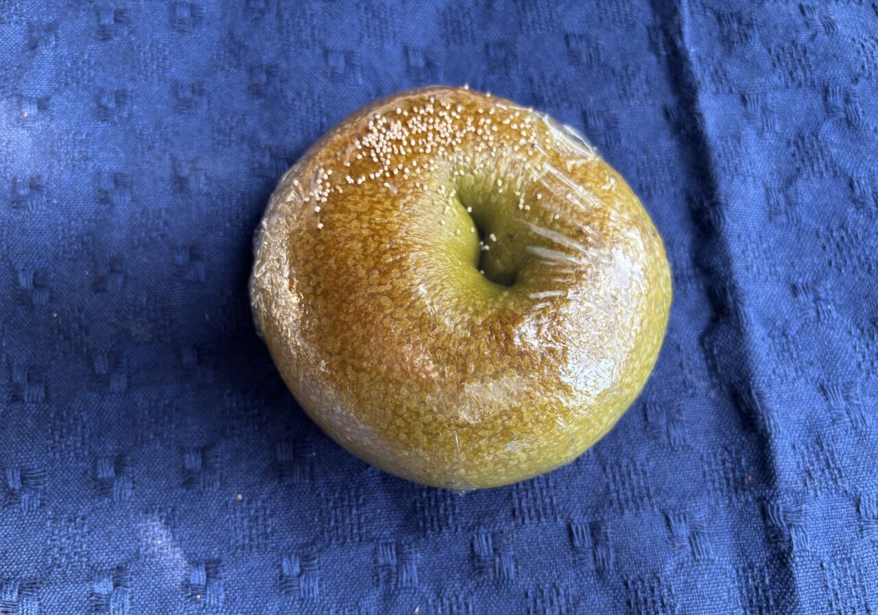 メニュー看板おかず系からスイーツ系まで、10種類ほどの商品が販売されているようです。お店のInstagramでも販売メニューが確認できます。購入した商品とともに、「ベーグルについて」などが記載された用紙が同梱されていました。ベーグルが並んだ棚案内によると、ベーグルは国産小麦「春よ恋」を使用しているとのこと。また、一部フィリングに使用している商品を除き、基本的には卵・油脂・乳製品不使用だそうです。