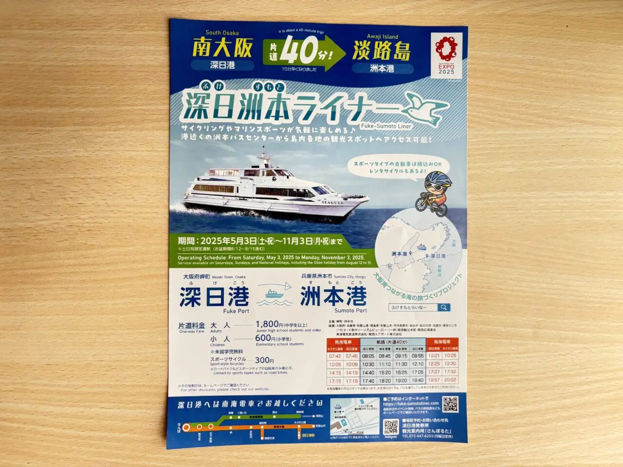 泉南郡岬町にある深日港から淡路島まで片道40分で到着する、深日洲本ライナーが11月3日(月・祝)まで土日祝限定で運行しています。