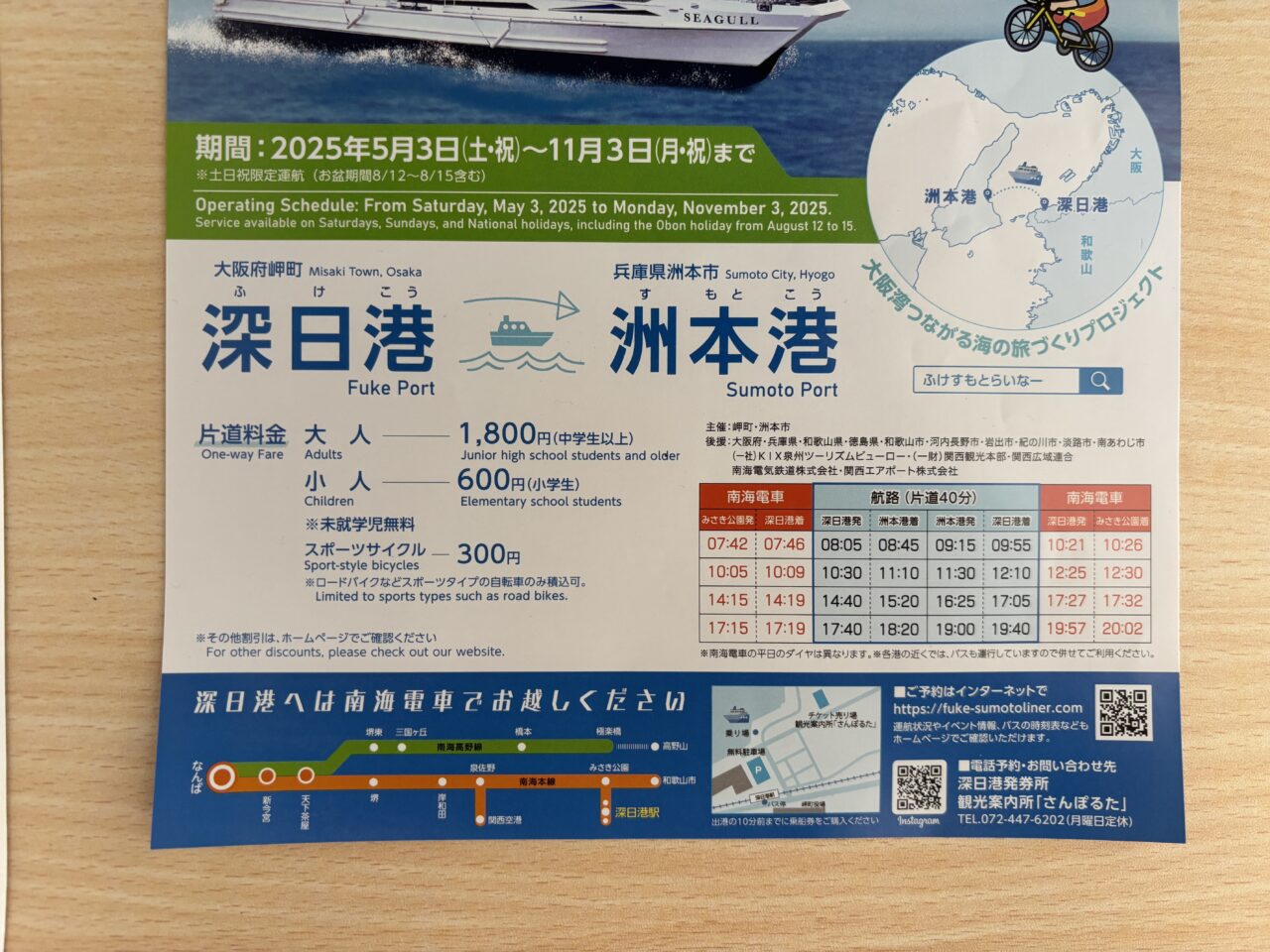 また、スポーツタイプの自転車に限り、積み込みも可能となっています(別途料金がかかります)。公式サイトによると、全便予約優先制で、当日は、空席があれば予約なしの乗船も可とのこと。混み合う便もあるため、事前に予約することを推奨されています。乗り場は、南海多奈川線「深日港」駅から3分ほどのところにあります。「深日港」駅の隣に、乗船者専用無料駐車場もあるようです。気になる方はぜひ利用してみてはいかがでしょうか。