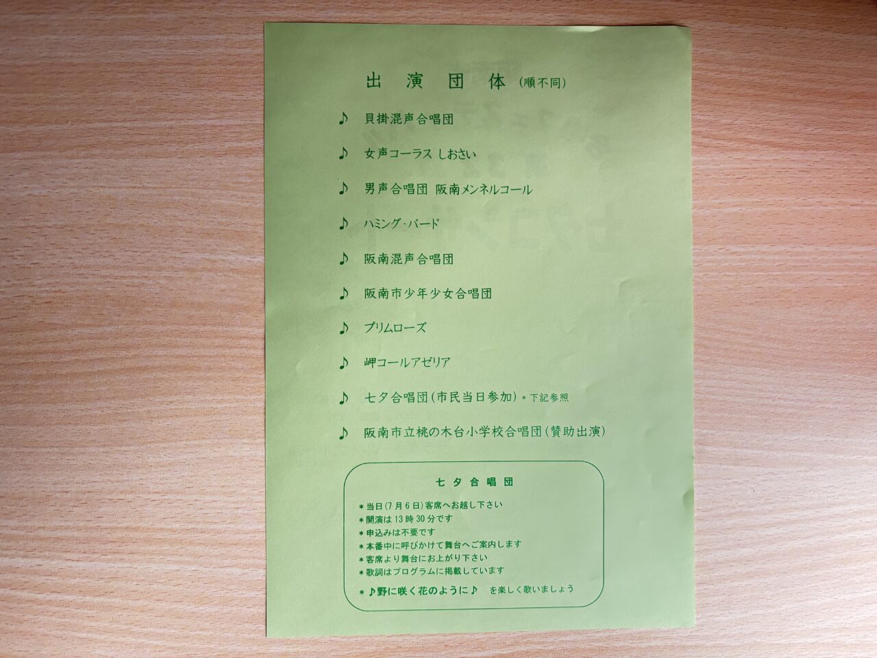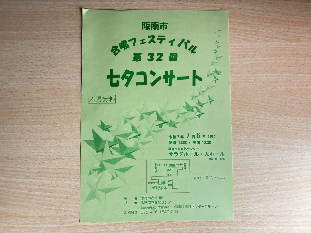 開場は13:00、開演は13:30の予定となっています。案内によると、当日は、阪南市で活動している合唱団体などが出演されるだけでなく、市民が当日参加できるプログラムもあるようです。市民当日参加の七夕合唱団への参加は事前申し込み不要とのこと。