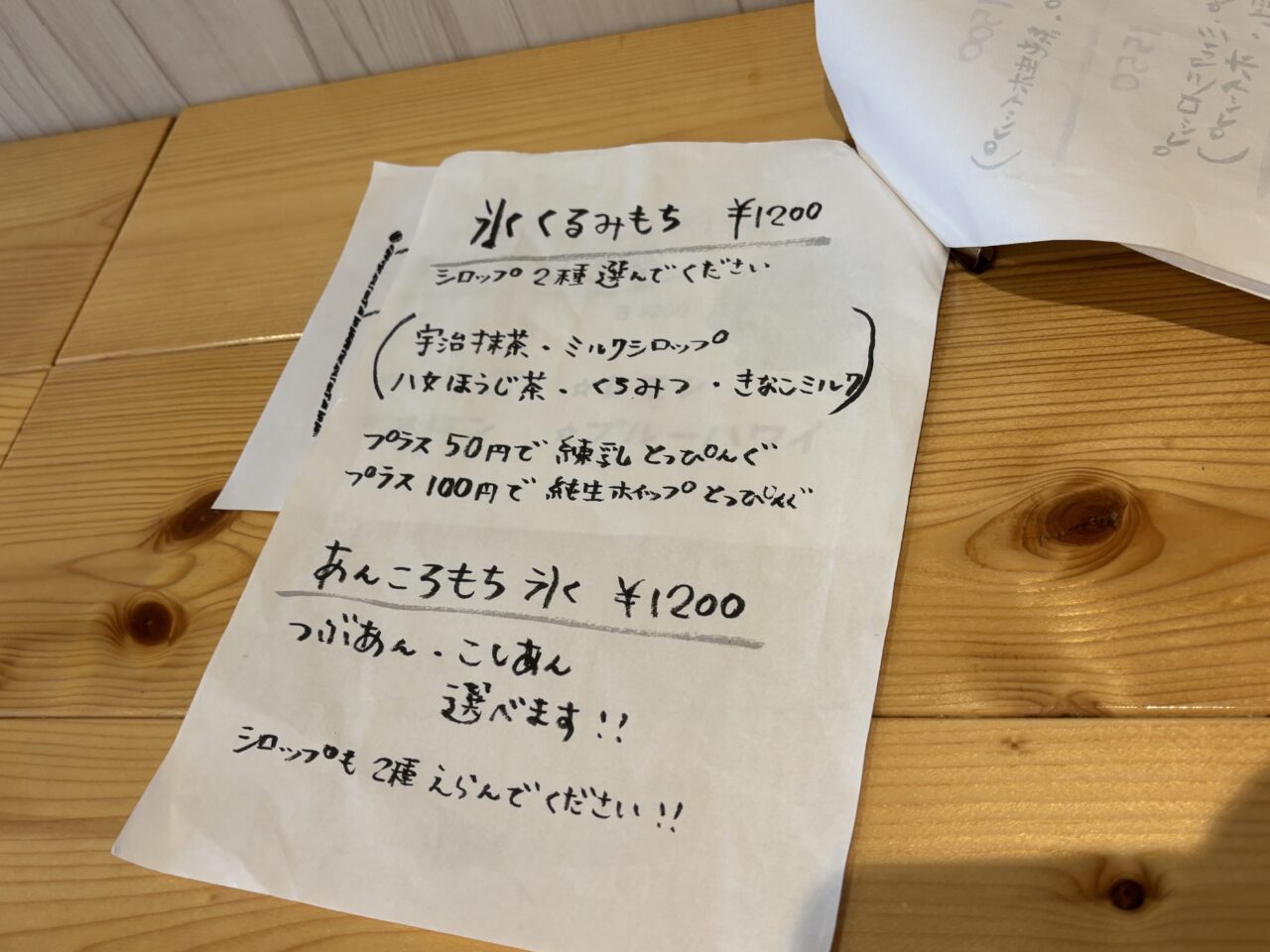 7月1日現在は、「生桃かき氷」を販売されているようです。その他、「氷くるみもち」、「あんころもち氷」などもありました。