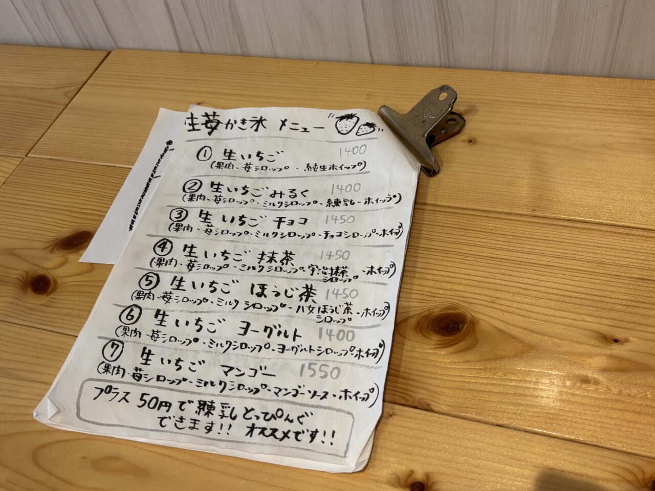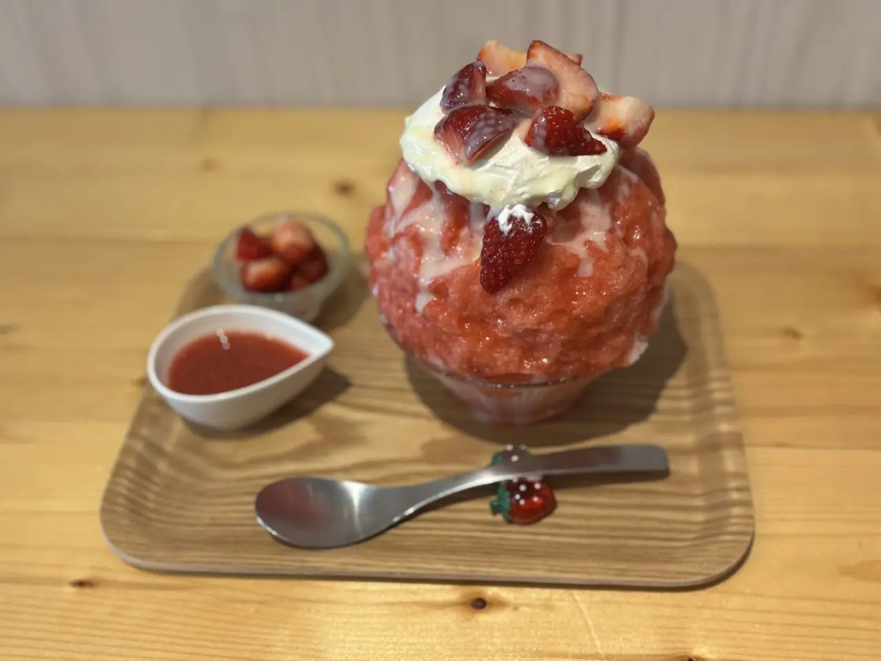 お店に伺った際には、「生苺かき氷」を提供されていました。メニューは複数あり、トッピングなども追加できるようです。生のフルーツがたっぷりと使用されている上、シロップもついています。