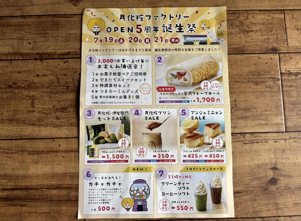 月化粧ファクトリー外観誕生祭限定の特別企画などが行われるようです。案内によると、誕生祭限定の「フルーツたっぷり贅沢クレープロール」の販売や、「月化粧・伊右衛門セット」、「月化粧プリン」、「アンジュミニョン」などの、人気商品がお得に買えるSALEも開催予定。これらは、各日数量限定のようですので、ご注意ください。
