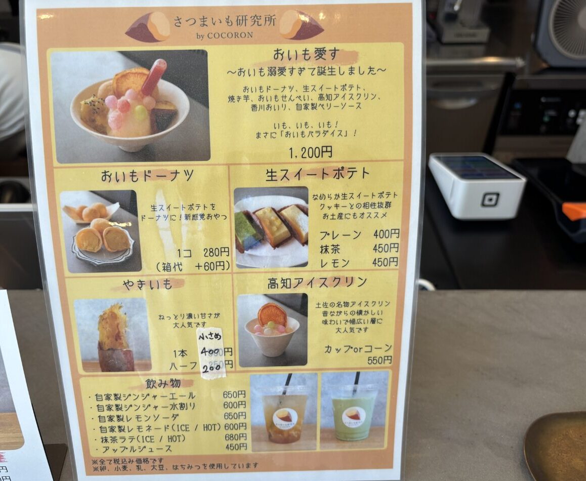 お店に伺ったのは平日お昼頃でしたが、すでに生スイートポテトは残り少なく、人気ぶりが伺えました。「おいもせんべい」もあり、おいも好きにはたまらないメニューの数々です。「おいもせんべい」とはさつまいもチップスのことで、高知県の一部地域で親しまれている愛称だそうです。