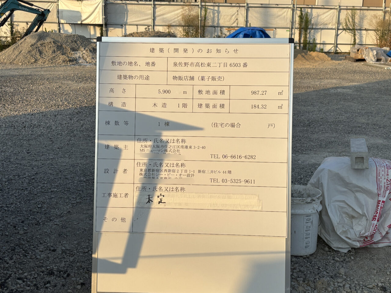 案内看板によると、「物販店舗(菓子販売)」がオープン予定とのこと。建築主は「MSニューマン株式会社」となっています。会社の公式サイトによると、MSニューマン株式会社は、シャトレーゼやコメダ珈琲などの事業を行っている会社です。