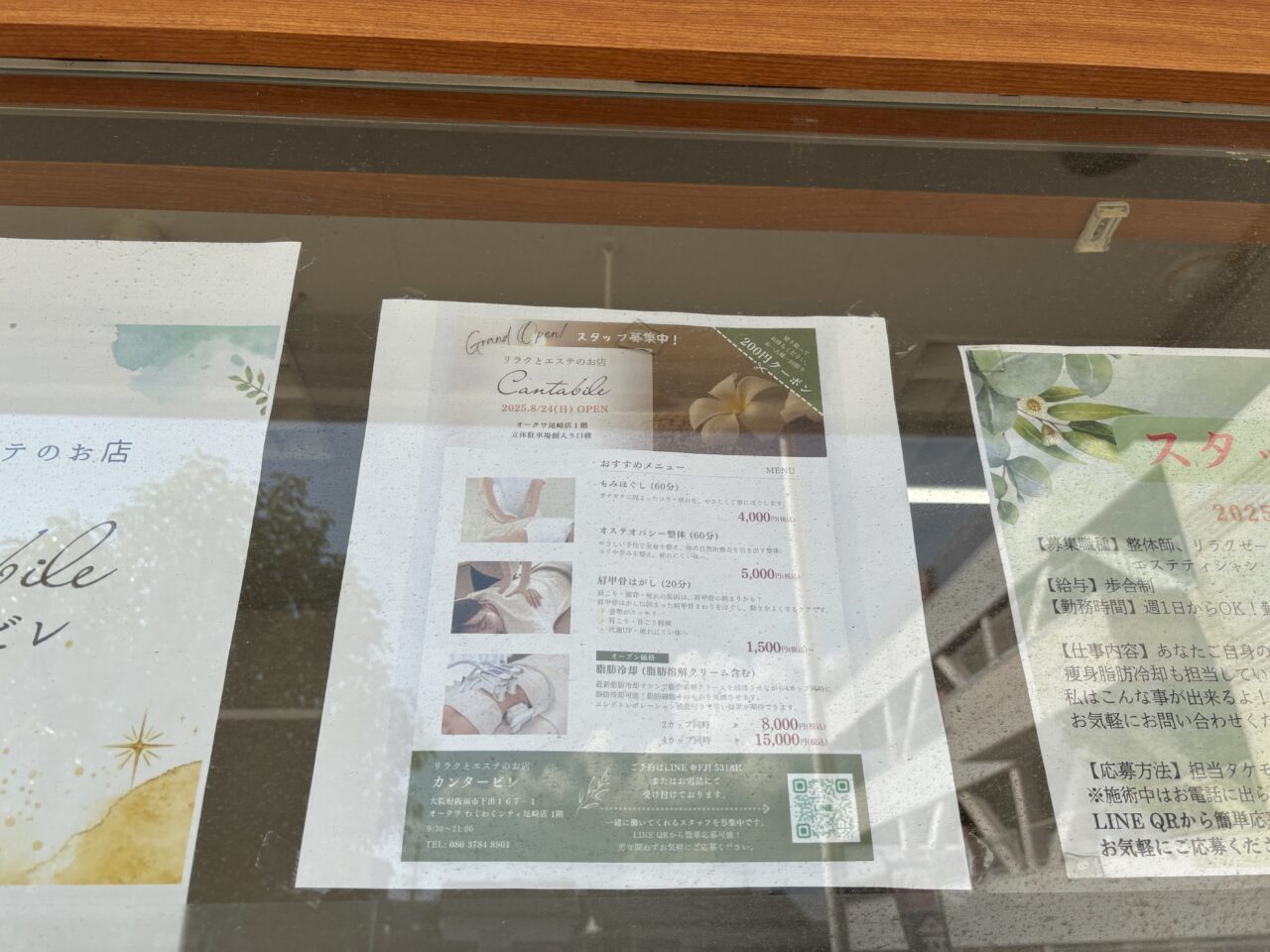 こちらのお店は、移転オープンとなるそうで、以前は自宅サロン(女性専用)だったそうですが、移転オープンを機に男女ともに利用可能となるようです。メニューが載った案内もあり、「もみほぐし」や「オステオパシー整体」、「肩甲骨はがし」などがおすすめだそうです。予約はLINEまた電話で受付けているとのこと。営業時間は9:30〜21:00。