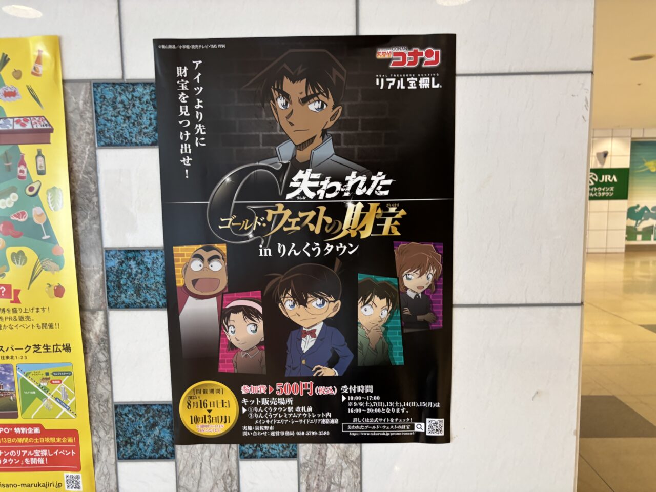 JR空港線・南海空港線「りんくうタウン」駅。こちらでは、人気アニメ「名探偵コナン×リアル宝探し in りんくうタウン」が開催されています。イベントは、2025年7月5日〜10月13日まで約3ヶ月間開催される予定です(期間中の土日祝のみ)。イベントの前半・後半で謎解きの内容が変更され、8月16日からは「失われたゴールド・ウェストの財宝」に変更となっています。