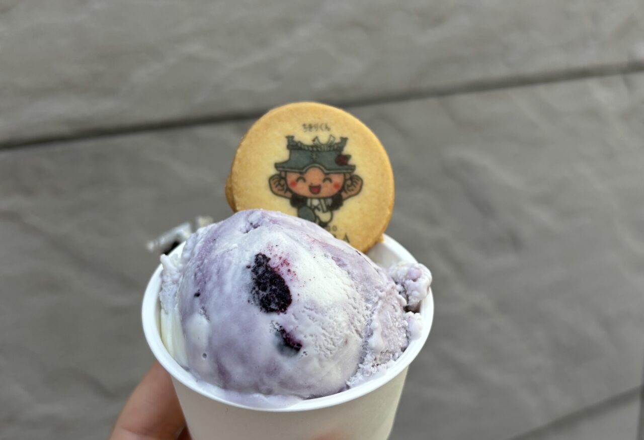 価格は、カップかコーン、サイズに応じて異なるようです。今回は、人気のフレーバーの「ブルーベリーチーズ」のカップ(small)を注文しました。お店に伺った際、お店のアカウントをフォローしている方に、トッピング(岸和田のキャラクター「ちきりくん」のクッキー)をプレゼントされているとのことでした。袋のまま持ち帰るのも可能とのことでしたが、せっかくなのでアイスへのせていただくことに。