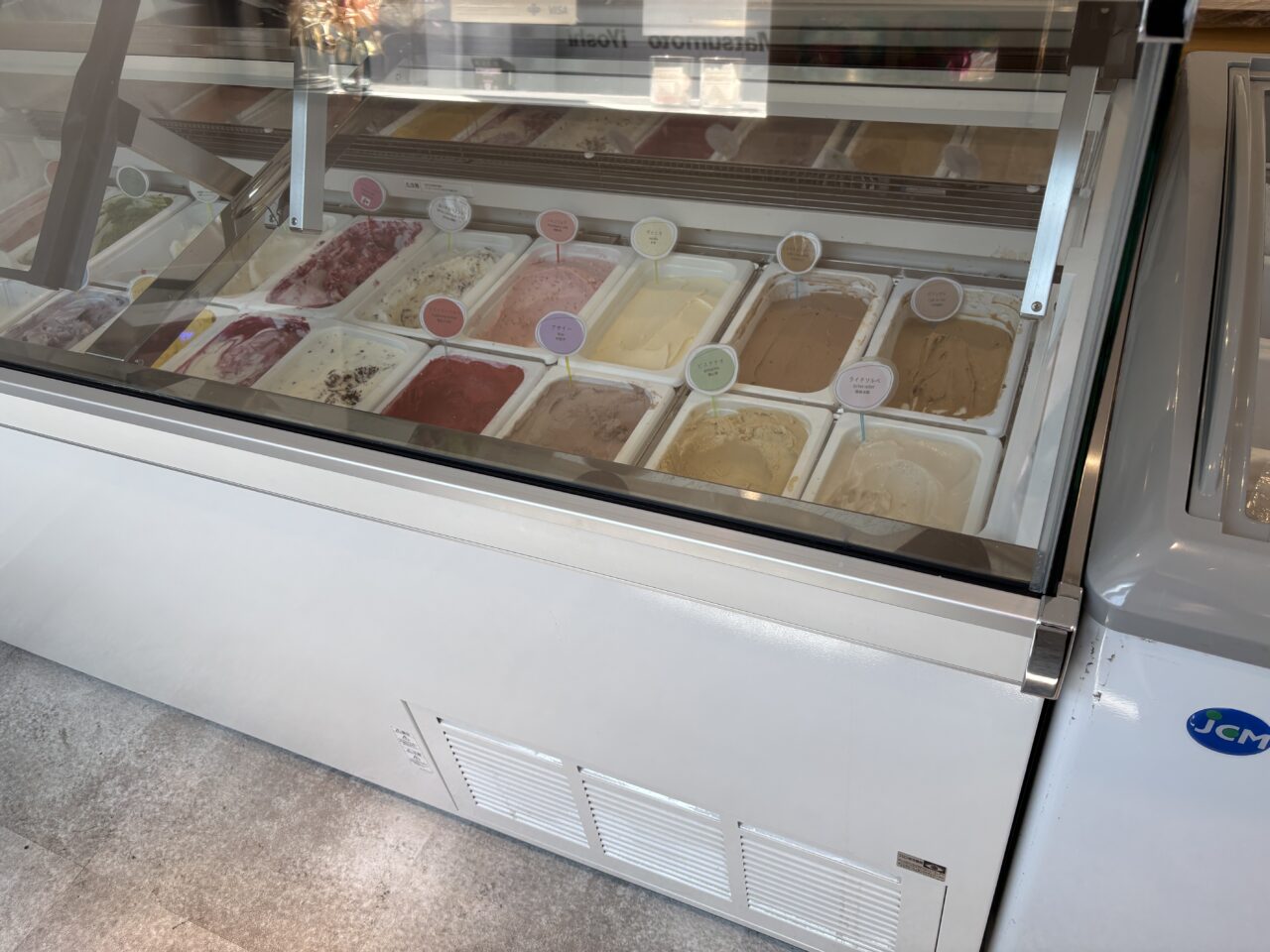 ディッシャージェラートのフレーバーは10種類以上。コーンかカップか選べます。価格は、カップとコーン、サイズごとに異なります。サイズは、「small(ディッシャー1個)」、「medium(ディッシャー2個)」、「large(ディッシャー3個)」の3種類。ワッフルコーンは「small」と、「medium」の2種類から選べます。