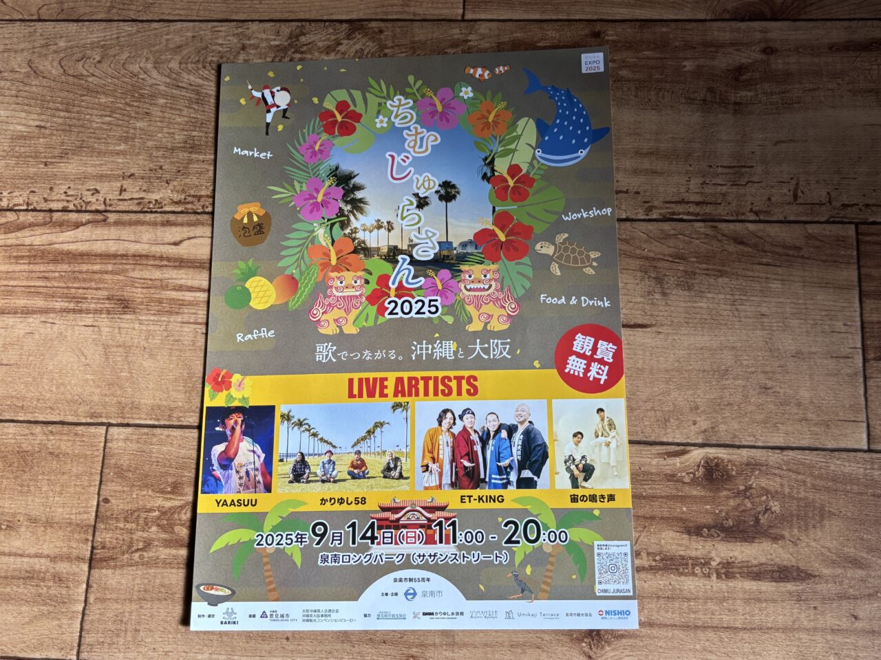 9月14日(日)には、「ちむじゅらさん2025〜歌でつながる。沖縄と大阪〜」が行われます。開催時間は、11:00〜20:00。こちらのイベントでは、宮古島出身のYAASUU、沖縄出身の宙の鳴き声、泉南市観光大使のET-KING、豊見城市観光大使のかりゆし58が出演する、この日限りの特別ステージが予定されています。観覧無料です。公式Instagramでは、当日のタイムスケジュールの案内も。