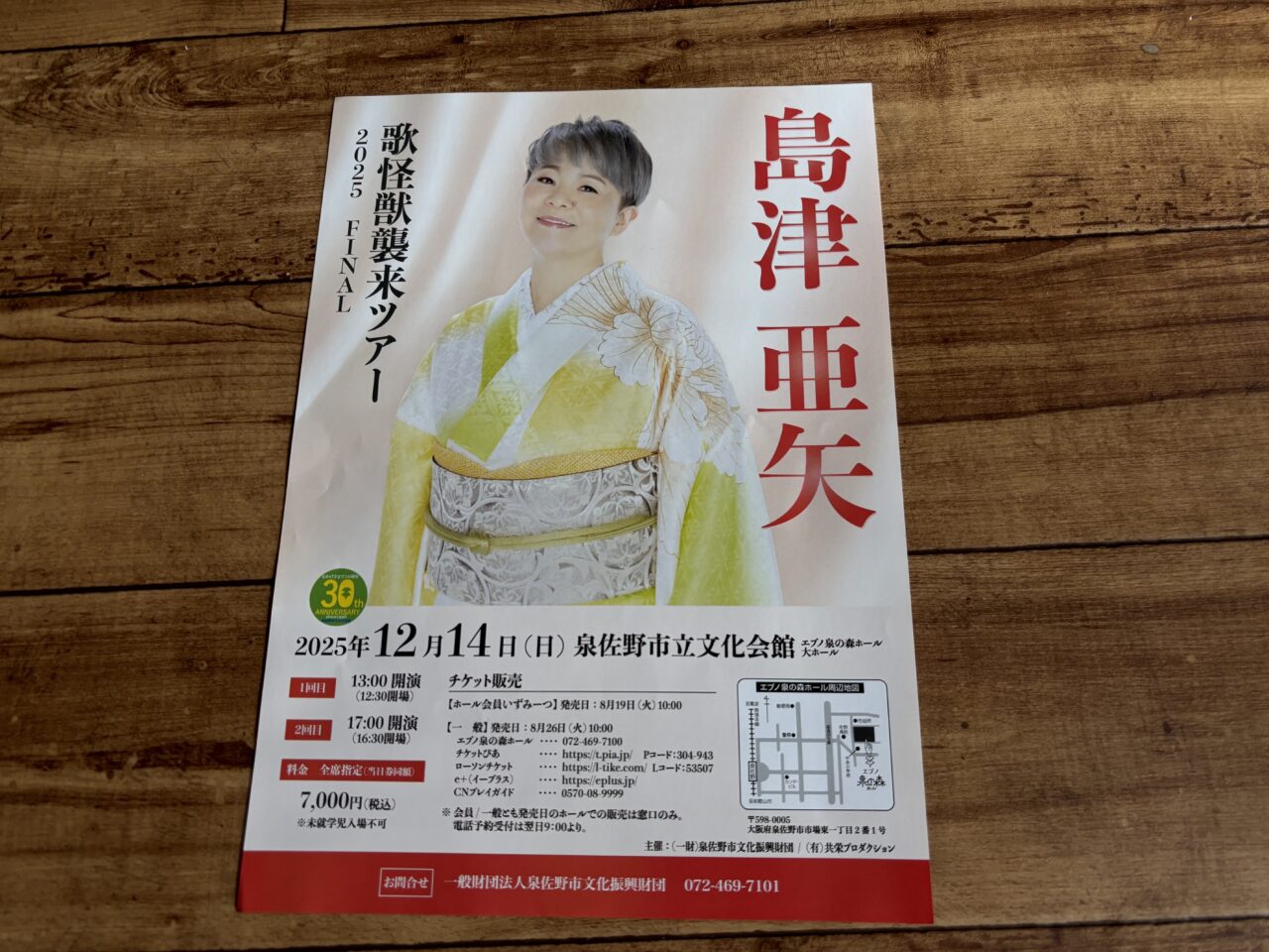 また、12月14日(日)には島津亜矢さんの「歌怪獣襲来ツアー2025 FINAL」が予定されています。どちらもチケットの販売が開始しているようで、館内に多数の公演案内が掲示されていました。泉の森ホールの他、各種チケットサイトでも取り扱いがあるようです。9月8日時点でチケットサイトを確認したところ、どちらの公演もまだチケットが販売中となっていました。