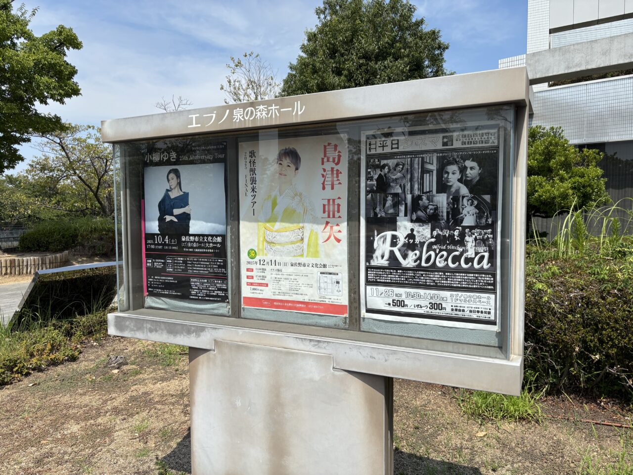 泉の森ホールに訪れたところ、館内には多くのの公演の案内がありました。なかでも注目のイベントとして、多数の公演案内が掲示されていたのは、歌手の小柳ゆきさんと島津亜矢さんの公演です。館内だけでなく、館外の掲示板にも案内がありました。
