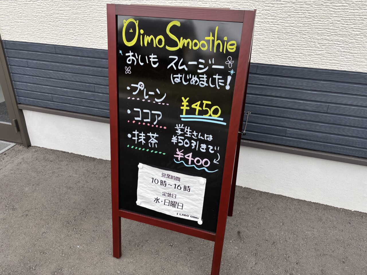 また、お店に伺った日はありませんでしたが、崩れてしまった部分や変色してしまったものを集めた「かわいそうな干し芋」も販売しています。他にも「おいもスムージー」の販売も。案内看板が店頭にありました。案内によると、「プレーン」、「抹茶」、「ココア」の3種類を提供。学生の方は割引もあるようです。