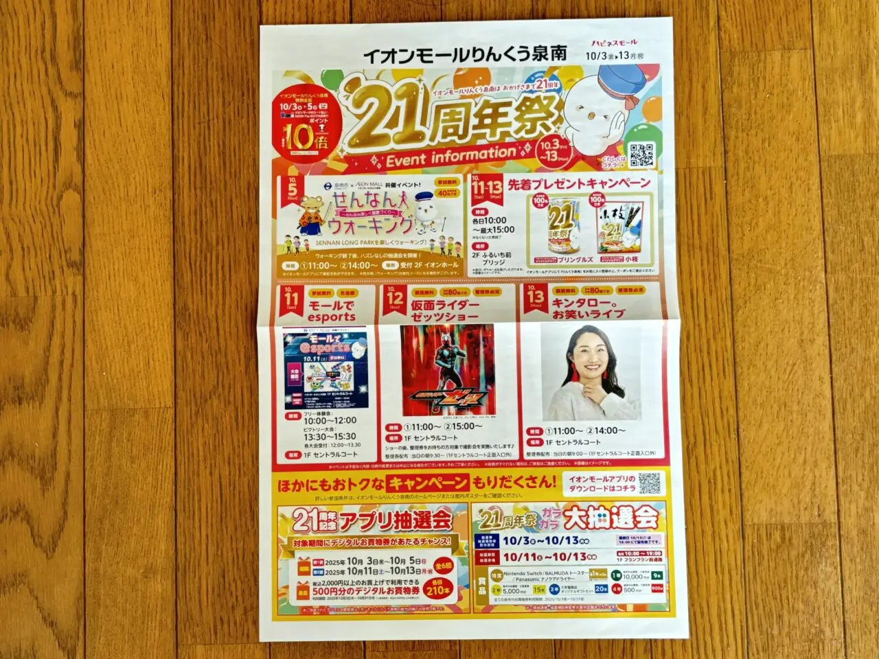 イオンモールりんくう泉南21周年セールの案内10月13日(月・祝)まで開催されるこちらのイベントでは、さまざまな催しが予定されています。案内によると、期間中、専門店などでお得に購入できるチャンスです。また、買い物をしたら参加できる「21周年祭ガラガラ大抽選会」も行われます。