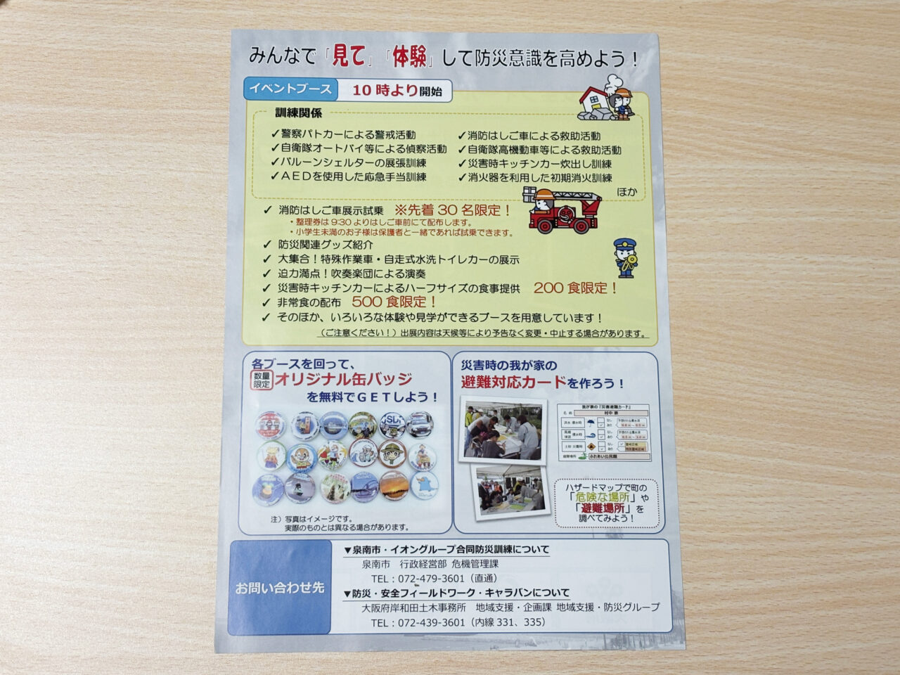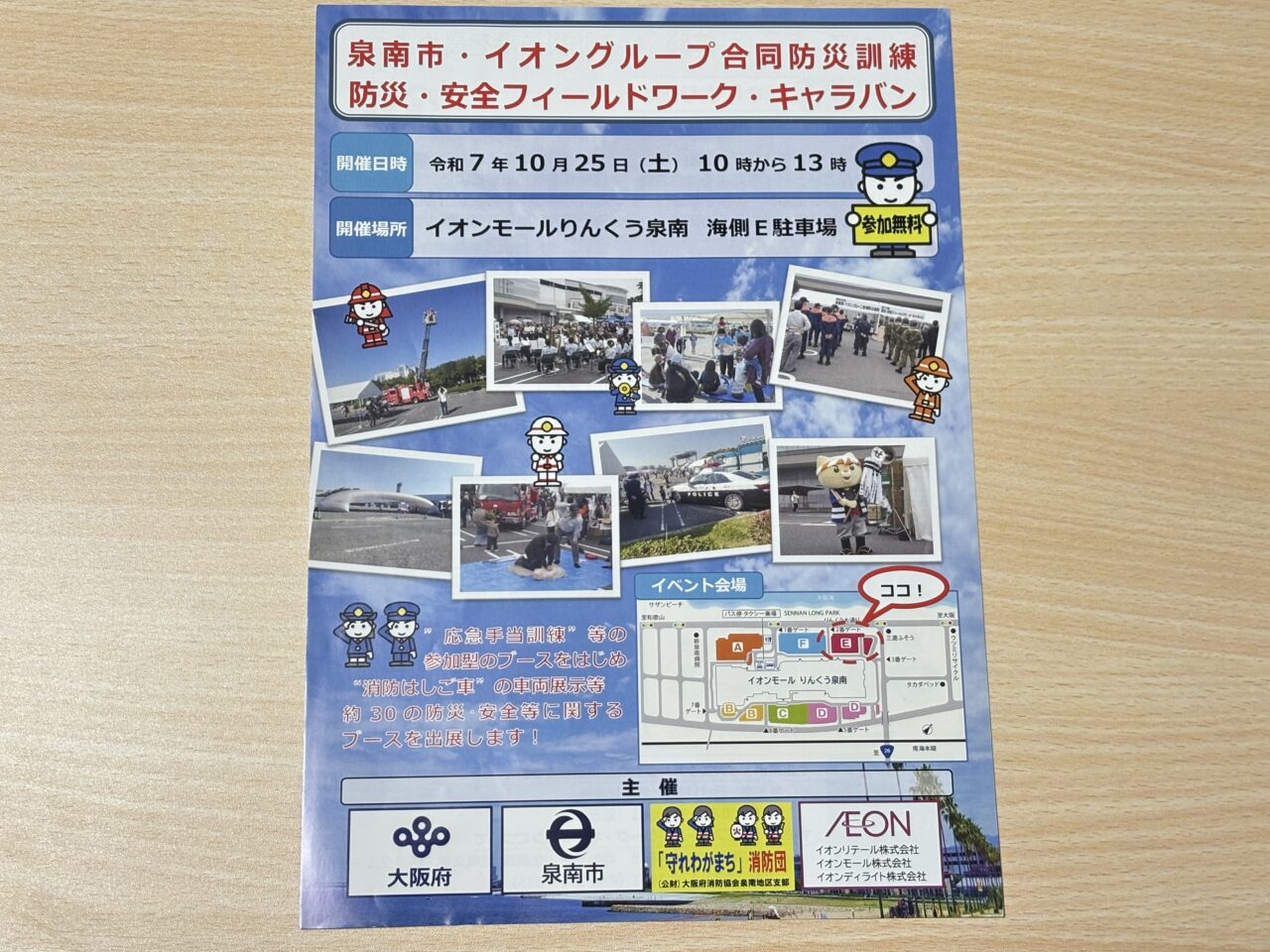 【泉南市】10月25日に、イオンモールりんくう泉南で、泉南市と合同防災訓練が行われます。