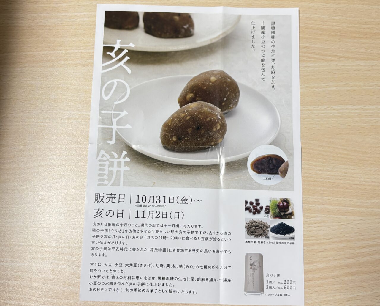 巾着のプレゼントはお一人様1個まで、とのこと。期間中であってもなくなり次第終了とのことですので、ご注意ください。また、10月31日から数量限定で「亥の子餅」の販売も行われる予定だそうです。