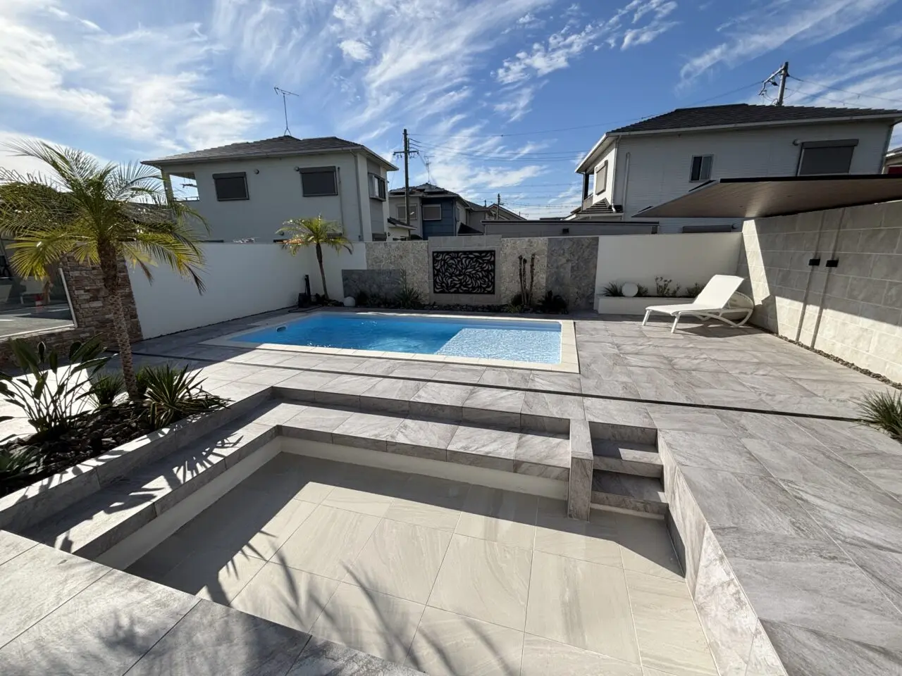 こちらでは、デジョユプール展示場「Rizis(ライジィス)」を併設しているそうです。スタッフの方にご案内いただき、プールを見せていただきました。お店に伺った日は天気が良かったこともあり、リゾート感あふれる景色が楽しめました。