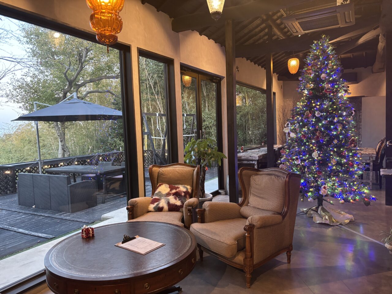 buddies'外観お店に伺ったのは2025年12月の初旬だったので、お店の外観・店内ともに、クリスマス仕様になっていました。店内には、大きなツリーも。クリスマスツリーを眺めながら、食事やスイーツなどを楽しむことができます。