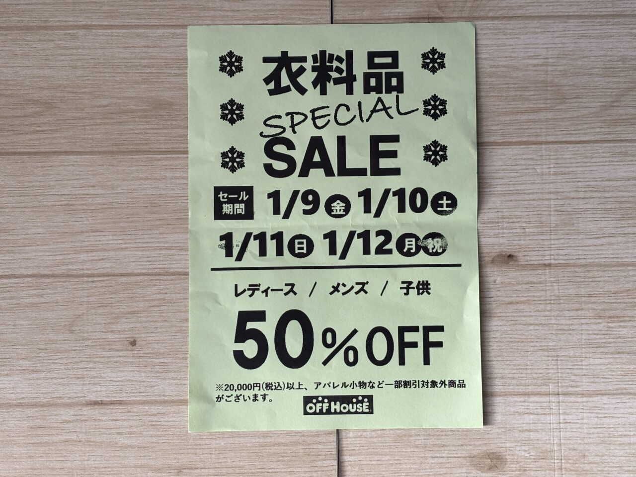 セール期間は、2026年1月9日(金)〜1月12日(月・祝)までの4日間限定となっています。店内には、多くのチラシや案内が掲示されていました。セールでは、レディース・メンズ・子供服のいずれも、レジにて表示価格から50%OFFとなるそうです。