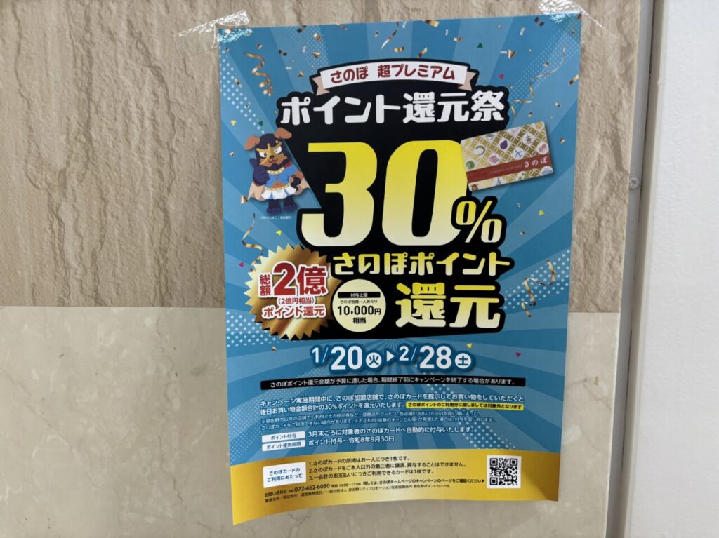 泉佐野市の地域ポイント「さのぽ」の「超プレミアムポイント還元祭」がスタートします。案内によると、キャンペーン期間中に、さのぽ加盟店での買い物合計額の最大30%(上限10,000ポイント)が還元されるそうです。キャンペーンの開催期間は2026年1月20日から2月28日まで。