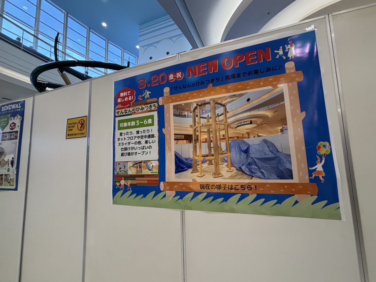 「ONWARD CROSSET SELECT」「せんなんのひみつきち」は、1Fグリーンコート入り口を入ってすぐのところにできるようで、訪れた際には着々と工事が進んでいました。