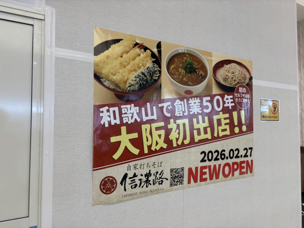 2F・フードコートに大阪初出店のお店「自家打ちそば 信濃路」が2026年2月27日にOPEN。写真はないのですが、同じくフードコートに「丸亀製麺」の出店情報も掲示されており、4月17日オープン予定とのこと。また、1Fに「ゴンチャ」もNEW OPEN予定。こちら掲示では4月中旬となっていますが、公式サイトによると、4月16日にオープンすることが決定したようです。