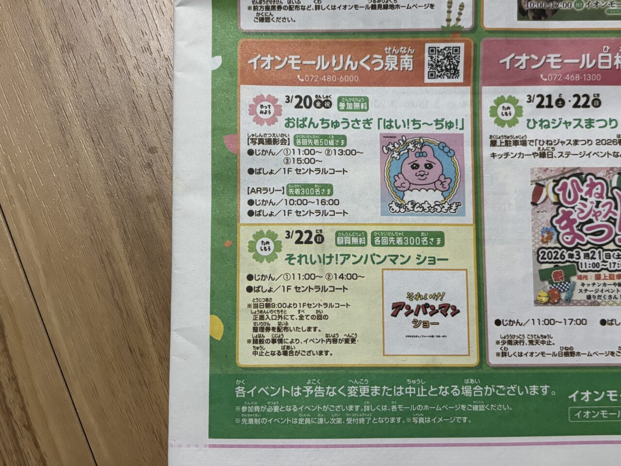 泉南市りんくう南浜にあるイオンモールりんくう泉南。こちらでは、2026年3月20日〜22日までの3連休に、人気キャラクターのイベントが行われる予定です。