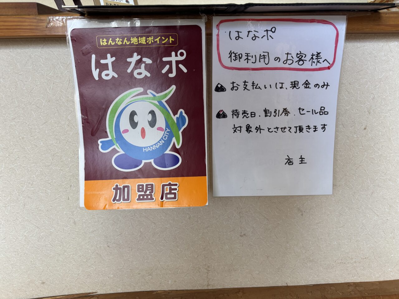 こちらでは、現金以外に、PayPayでの支払いに対応されています。店内には、はなポ利用時の案内が掲示されており、はなポを利用する際の支払い方法は現金のみとなるそうですので、ご注意ください。また、お店のおむすびは、店舗以外に「阪南市役所サラステ前」やイオンモールりんくう泉南1Fにある「わくわく広場」で購入することもできます。気になった方は「おむすび処にんに」のおむすびを購入してみてはいかがでしょうか。